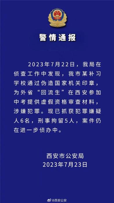 中新網(wǎng)7月23日電 據(jù)陜西省西安市公安局官方微博消息,西安市公安局23日發(fā)布警情通報稱,2023年7月22日,該局在偵查工作中發(fā)現(xiàn),西安市某補習學校通過偽造國家機關印章,為外省“回流生”在西安參加中考提供虛假資格審查材料,涉嫌犯罪?,F(xiàn)已抓獲犯罪嫌疑人6名,刑事拘留5人,案件仍在進一步偵辦中。