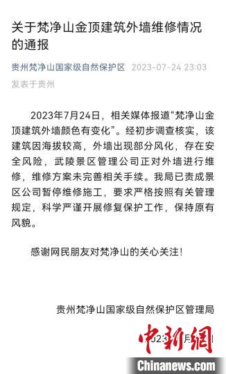 7月24日,有媒體報(bào)道“梵凈山金頂建筑外墻顏色有變化”,原本灰色墻體被刷成了粉紅色,不少網(wǎng)友提出疑問(wèn),梵凈山作為世界自然遺產(chǎn)地是否可以隨意粉刷?對(duì)此,管理局作出上述回應(yīng)。