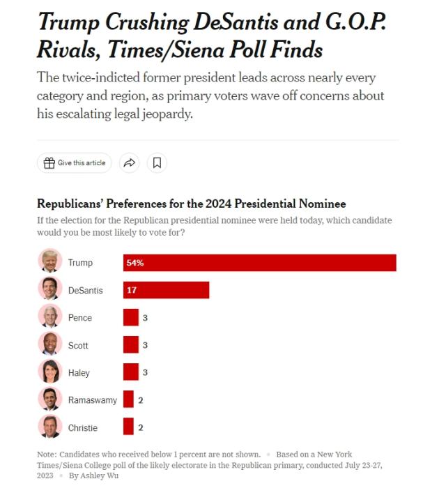 中新網(wǎng)7月31日電 據(jù)《紐約時(shí)報(bào)》報(bào)道,《紐約時(shí)報(bào)》和錫耶納學(xué)院31日公布了一項(xiàng)針對(duì)共和黨選民的聯(lián)合民意調(diào)查結(jié)果:在所有的共和黨總統(tǒng)競選人中,特朗普以54%的支持率取得絕對(duì)領(lǐng)先地位,超出第二位德桑蒂斯37%,其余候選人支持率均未超過3%。