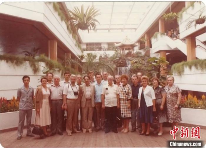 1983年10月,應(yīng)中國(guó)人民對(duì)外友好協(xié)會(huì)和中蘇友好協(xié)會(huì)邀請(qǐng),時(shí)任蘇中友好協(xié)會(huì)主席謝爾蓋·列昂尼多維奇·齊赫文斯基率代表團(tuán)前往中國(guó)。圖為代表團(tuán)成員在廣州白天鵝賓館合影。圖片來源:庫(kù)利科娃個(gè)人搜集的檔案資料
