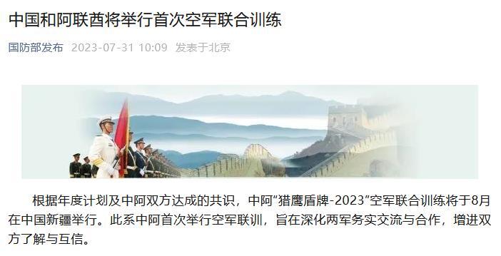 中新網(wǎng)7月31日電 據(jù)“國防部發(fā)布”微信公眾號31日消息,根據(jù)年度計劃及中阿雙方達成的共識,中阿“獵鷹盾牌-2023”空軍聯(lián)合訓(xùn)練將于8月在中國新疆舉行。此系中阿首次舉行空軍聯(lián)訓(xùn),旨在深化兩軍務(wù)實交流與合作,增進雙方了解與互信。