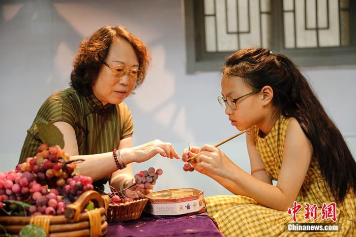 祖孫二人正在做“葡萄常”。中新網(wǎng)記者 翟璐 攝