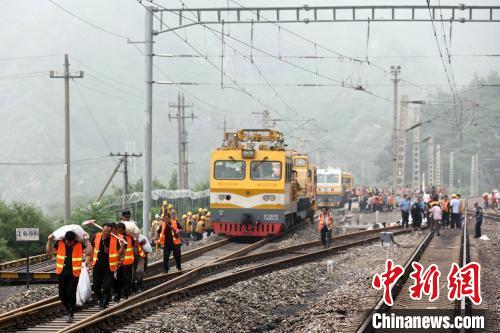 8月1日,北京門頭溝區(qū),豐沙鐵路妙峰山鎮(zhèn)水峪嘴村段,工作人員前往鐵路線清淤搶修。7月29日以來,北京地區(qū)持續(xù)強(qiáng)降雨,西南部降雨量大。受降雨影響,北京豐臺(tái)至沙城鐵路(豐沙線)嚴(yán)重水害?!≈行律缬浾?盛佳鵬 攝