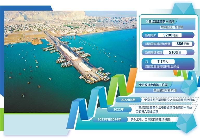 當前正處于中巴經(jīng)濟走廊建設的第二階段,這也是至關重要的高質(zhì)量發(fā)展新階段。中巴雙方在走廊框架下,進一步加強巴國工業(yè)化進程、人力資源培訓和產(chǎn)業(yè)園區(qū)建設,在扶貧、醫(yī)療、農(nóng)業(yè)以及互聯(lián)網(wǎng)等眾多與民生息息相關的領域持續(xù)深化合作,力求創(chuàng)造更多就業(yè)機會,不斷推動巴基斯坦的經(jīng)濟和社會現(xiàn)代化發(fā)展,造福當?shù)孛癖姟?022年6月,中國援助巴基斯坦瓜達爾東灣快速路通車,打通了瓜達爾港和卡拉奇之間的交通運輸通道。同年,中巴經(jīng)濟走廊首個水電投資項目——卡洛特水電站全面投入商業(yè)運營,每年將向巴基斯坦提供32億千瓦時廉價清潔電能,滿足當?shù)?00萬人用電需求,每年可節(jié)約標準煤約140萬噸,減少二氧化碳排放350萬噸。今明兩年,走廊框架下的多個水電、風電項目將陸續(xù)投運,未來巴基斯坦在清潔能源領域大有可為。