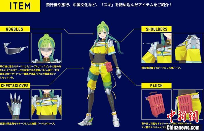 她的頭發(fā)和眼睛是綠色的,因?yàn)榫G色是公司的代表色。此外,她身上有許多航空元素,護(hù)目鏡采用了飛機(jī)前窗的樣式,胸口和手套的原型是飛機(jī)的滑行道,肩膀上參考了機(jī)翼的設(shè)計(jì),腰間還掛著一個(gè)行李箱樣式的小包。