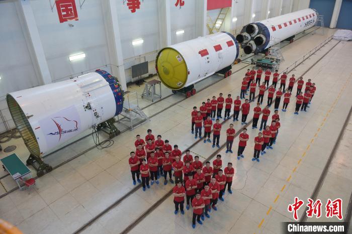 8月1日,長(zhǎng)征四號(hào)丙運(yùn)載火箭研制團(tuán)隊(duì)站成數(shù)字“100”的隊(duì)形。(中國(guó)航天科技集團(tuán)有限公司八院 供圖)