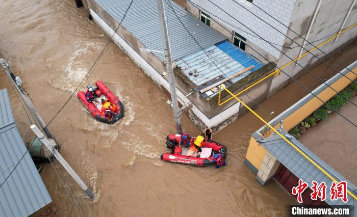 8月3日,藍(lán)天救援隊隊員在河北省涿州市刁窩鎮(zhèn)東馮村轉(zhuǎn)移村民。(無人機照片)中新社記者 翟羽佳 攝