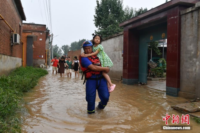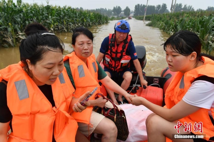 8月3日,藍(lán)天救援隊隊員在河北省涿州市刁窩鎮(zhèn)東馮村轉(zhuǎn)移村民。據(jù)該村村民介紹,當(dāng)日村里水位相比昨日有所下降,村中還有部分老人和孩子。經(jīng)過一上午救援,十余名村民被轉(zhuǎn)移到安全地帶。中新社記者 翟羽佳 攝