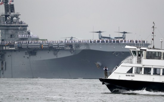 2017年5月24日,在美國紐約,美國海軍“基薩奇”號兩棲攻擊艦參加紐約艦隊(duì)周艦船巡游活動(dòng)。新華社記者王迎攝