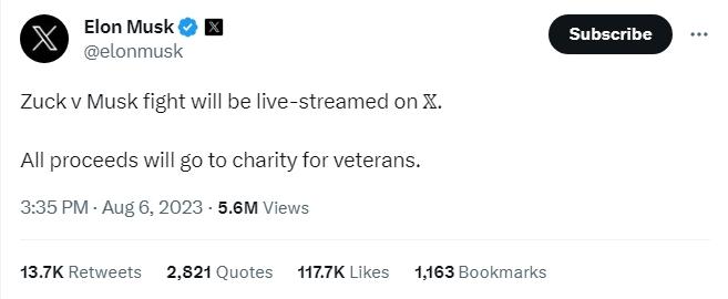 據(jù)報道,當天,馬斯克在社交媒體X發(fā)文稱,“扎克伯格與馬斯克之戰(zhàn)將在X上直播。所有收益將捐給退伍軍人慈善機構(gòu)?!?/p>