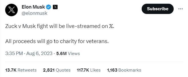 當(dāng)日晚些時候,扎克伯格在自家的社交平臺“Threads”上回應(yīng),“我已經(jīng)做好了準(zhǔn)備”,并說:“我們不應(yīng)該使用一個能真正籌措慈善資金的更可靠平臺嗎?”