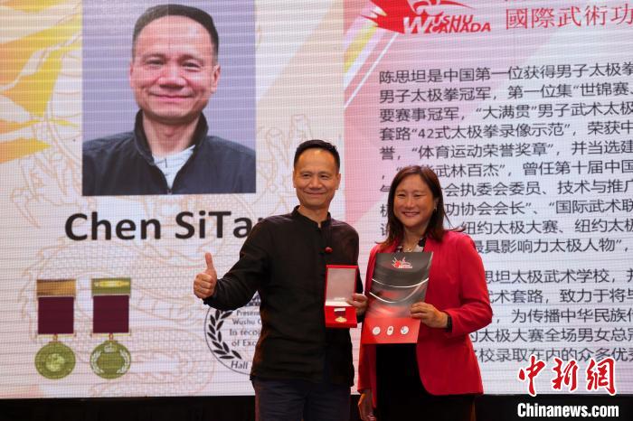 8月7日,加拿大聯(lián)邦眾議員葉嘉麗(右)向來(lái)自中國(guó)的太極名家陳思坦頒授國(guó)際武術(shù)功夫名人堂勛章?!≈行律缬浾?余瑞冬 攝
