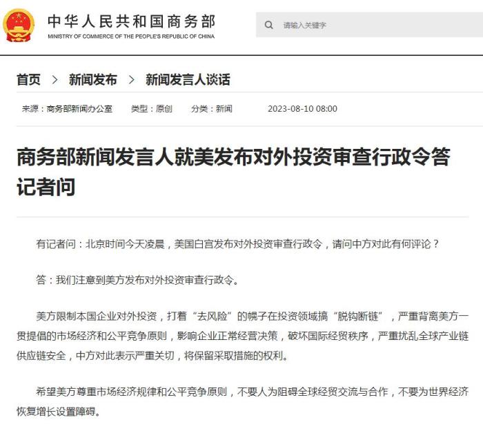 中國(guó)商務(wù)部新聞發(fā)言人8月10回應(yīng)稱(chēng),美方限制本國(guó)企業(yè)對(duì)外投資,打著“去風(fēng)險(xiǎn)”的幌子在投資領(lǐng)域搞“脫鉤斷鏈”,嚴(yán)重背離美方一貫提倡的市場(chǎng)經(jīng)濟(jì)和公平競(jìng)爭(zhēng)原則,影響企業(yè)正常經(jīng)營(yíng)決策,破壞國(guó)際經(jīng)貿(mào)秩序,嚴(yán)重?cái)_亂全球產(chǎn)業(yè)鏈供應(yīng)鏈安全,中方對(duì)此表示嚴(yán)重關(guān)切,將保留采取措施的權(quán)利。