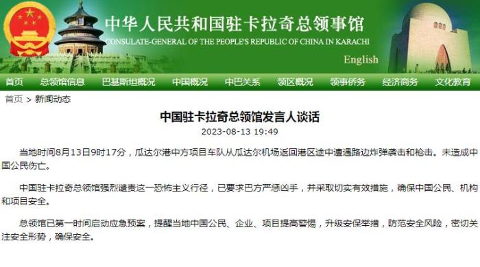 - 中國(guó)駐巴基斯坦使館就瓜達(dá)爾港中方車隊(duì)遭遇襲擊發(fā)布聲明