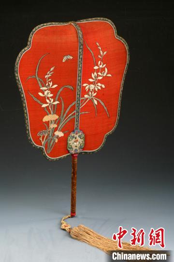 沈陽故宮院藏的清檀木柄大紅緙絲蘭蝶扇為清宮后妃日常生活用品。 (沈陽故宮博物院供圖)