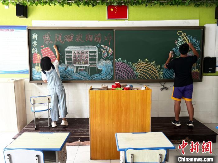 在一間教室里,來自夏村中學(xué)的教師丁玲正帶著學(xué)生徐俊熙繪制迎接新生的黑板報(bào),有大船、海浪、向日葵等圖案。徐俊熙開學(xué)上初二,他對(duì)記者說:“這個(gè)黑板報(bào)的主題‘乘風(fēng)破浪向前沖’,是為了激勵(lì)同學(xué)們要堅(jiān)強(qiáng)起來,不畏困難,積極向上?!?/p>