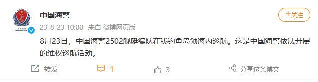 中新網(wǎng)8月23日電 據(jù)中國海警局官方微博消息,8月23日,中國海警2502艦艇編隊在中國釣魚島領(lǐng)海內(nèi)巡航。這是中國海警依法開展的維權(quán)巡航活動。