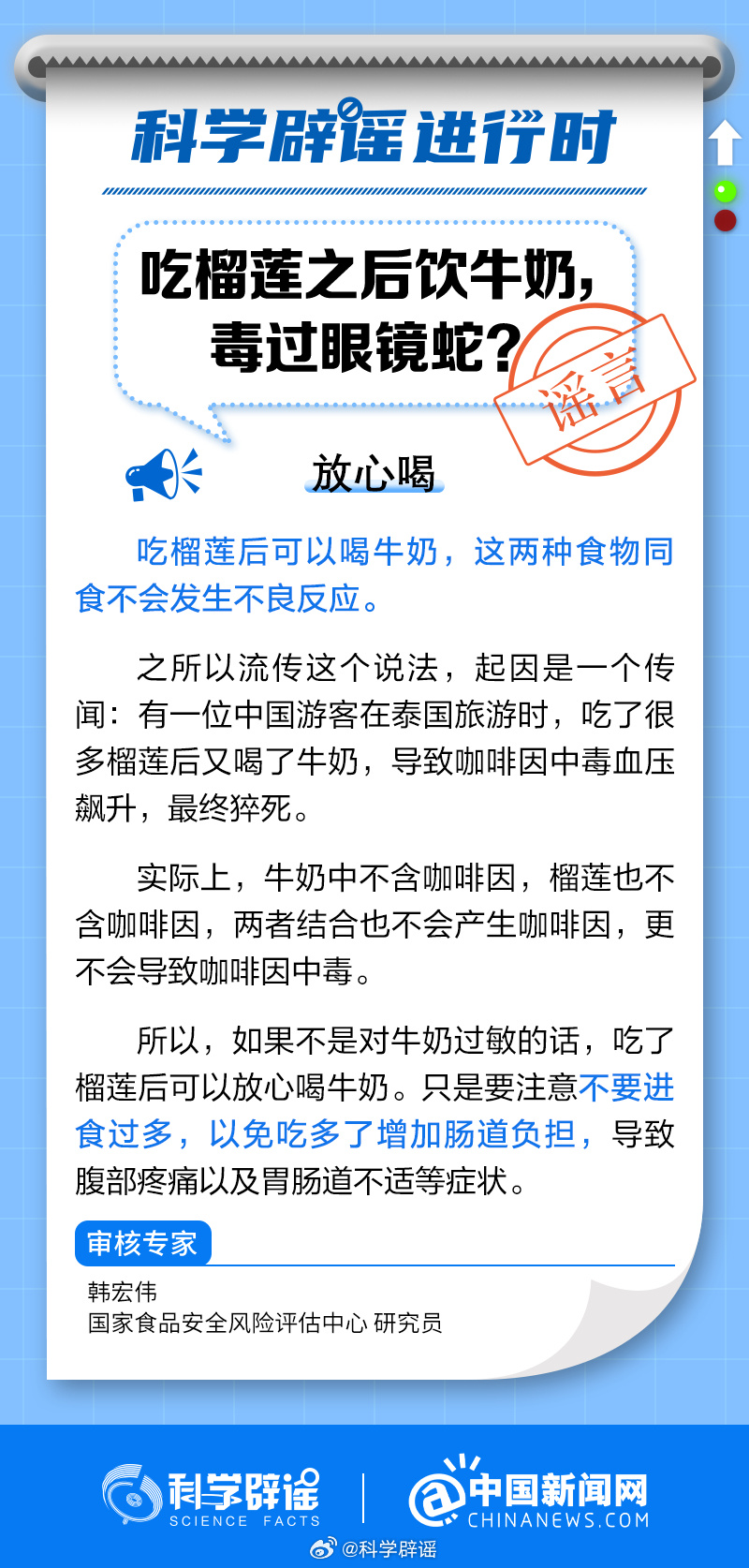 中新網8月24日電 吃榴蓮后可以喝牛奶,這兩種食物同食不會發(fā)生不良反應。之所以流傳這個說法,起因是一個傳聞:有一位中國游客在泰國旅游時,吃了很多榴蓮后又喝了牛奶,導致咖啡因中毒血壓飆升,最終猝死。實際上,牛奶中不含咖啡因,榴蓮也不含咖啡因,兩者結合也不會產生咖啡因,更不會導致咖啡因中毒。(來源:@科學辟謠 @中國新聞網 )
