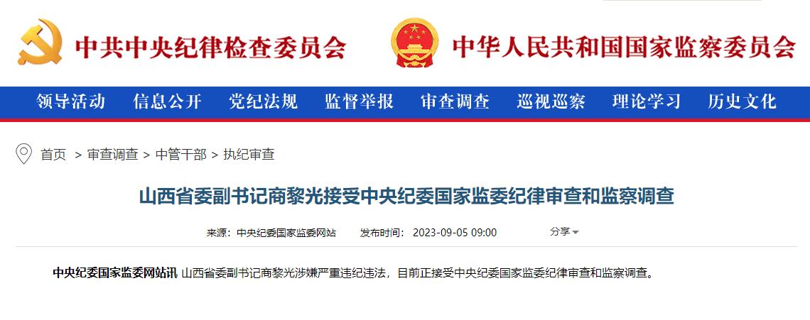 - 山西省委副書(shū)記商黎光接受中央紀(jì)委國(guó)家監(jiān)委紀(jì)律審查和監(jiān)察調(diào)查