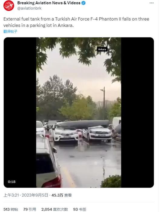 中新網(wǎng)9月6日電 綜合外媒報道,當?shù)貢r間9月4日,土耳其空軍一架戰(zhàn)斗機在飛行途中油箱突然掉落,砸中安卡拉市一露天停車場的汽車,所幸未造成人員傷亡。