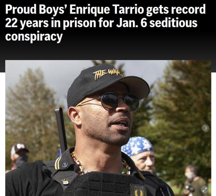 據(jù)報道,涉嫌幕后策劃2021年1月6日美國國會騷亂的極右翼組織“驕傲男孩”前主席塔里奧(Enrique Tarrio),于當?shù)貢r間5日在華盛頓特區(qū)聯(lián)邦法院被判處22年監(jiān)禁刑期,被控煽動陰謀等罪名。