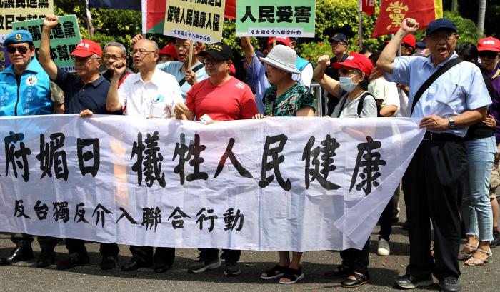 9月6日,臺(tái)灣數(shù)十個(gè)政黨和團(tuán)體組成的反“臺(tái)獨(dú)”反介入聯(lián)合行動(dòng)在臺(tái)北集會(huì),抗議日本將核污染水排入海洋,要求民進(jìn)黨當(dāng)局嚴(yán)禁從日本核污染地區(qū)進(jìn)口食物。圖為抗議現(xiàn)場(chǎng)。