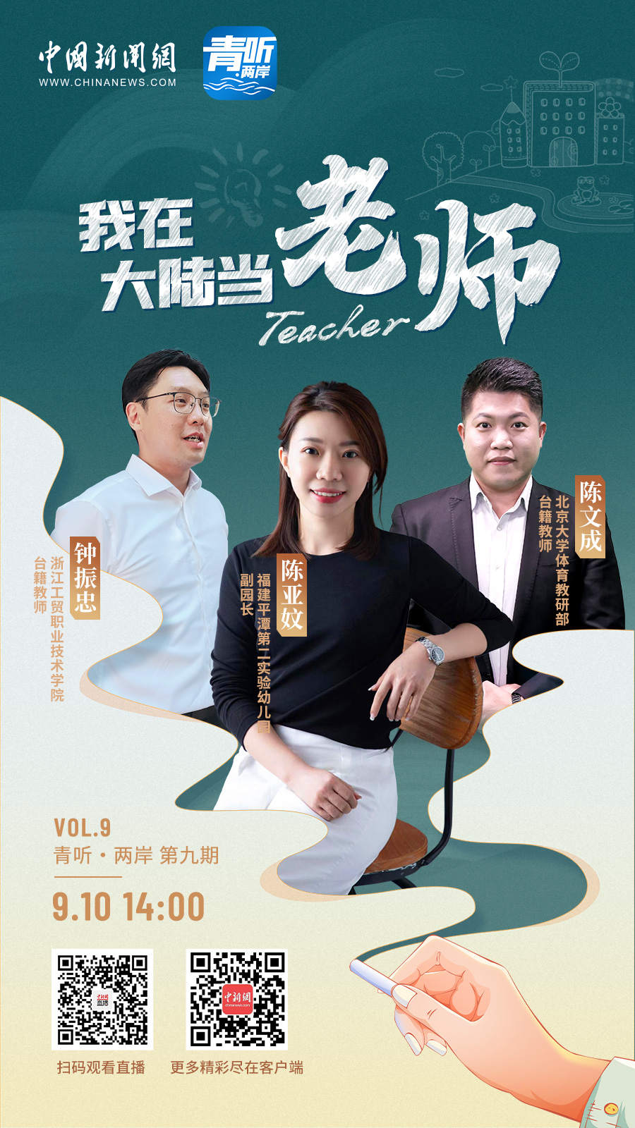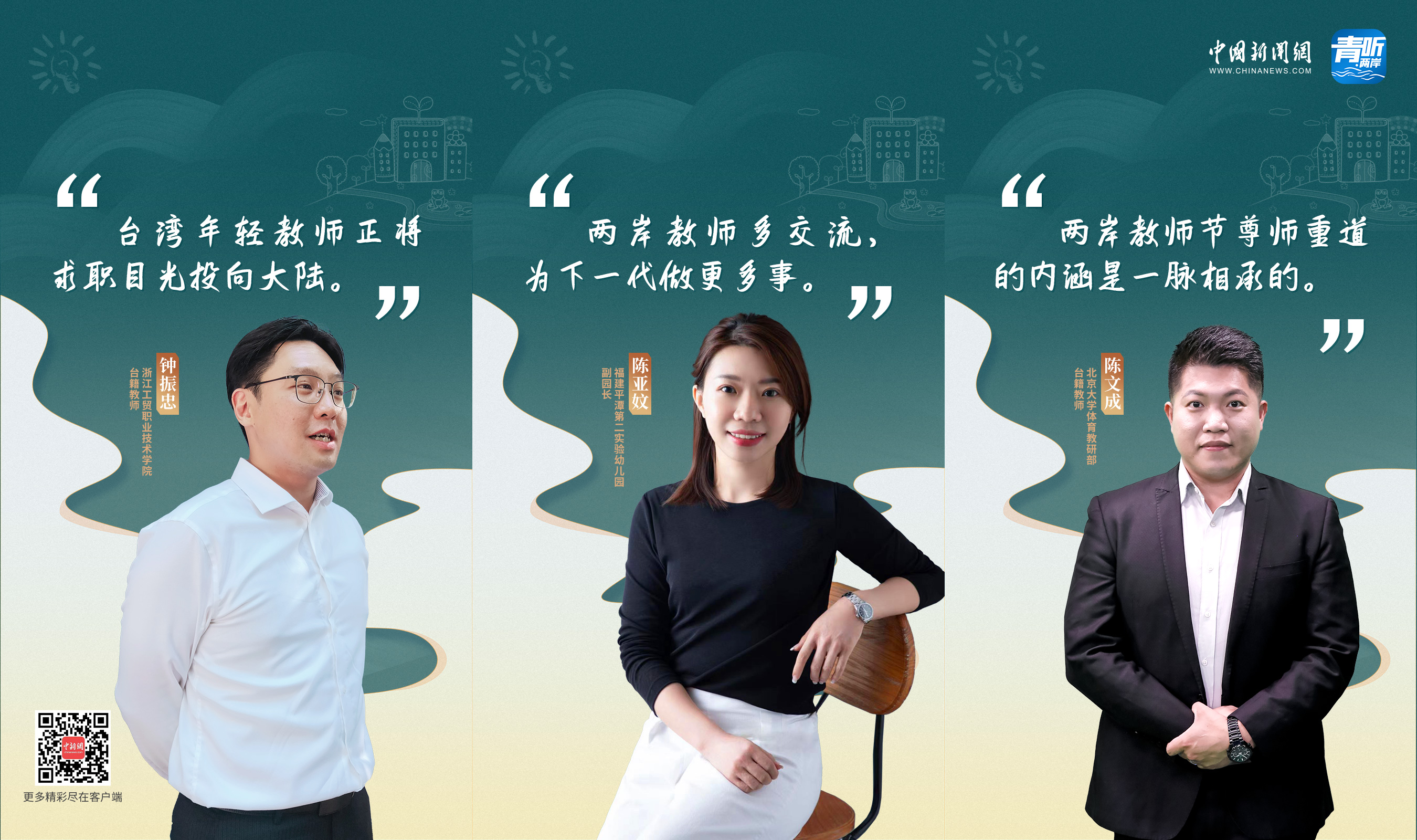 教師節(jié)這天,北京大學體育教研部教師陳文成、浙江工貿(mào)職業(yè)技術(shù)學院教師鐘振忠、福建平潭第二實驗幼兒園副園長陳亞妏,三位臺籍教師做客中國新聞網(wǎng)《青聽·兩岸》欄目,分享了他們“登陸”做老師的故事。