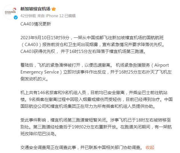 中新網(wǎng)北京9月10日電 據(jù)新加坡樟宜機(jī)場(chǎng)官方微博消息,2023年9月10日15時(shí)59分,一架從中國成都飛往新加坡樟宜機(jī)場(chǎng)的國航航班(CA403)報(bào)告前貨倉和衛(wèi)生間出現(xiàn)煙霧,宣布緊急情況并要求降落優(yōu)先權(quán)。CA403獲得優(yōu)先權(quán), 并于16時(shí)15分左右降落于樟宜機(jī)場(chǎng)第三跑道。