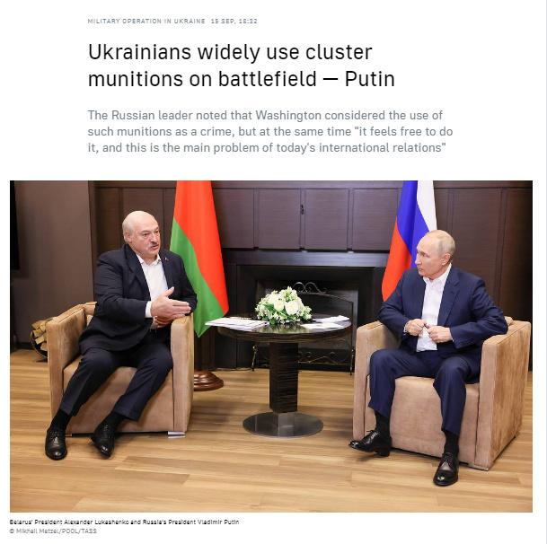 中新網(wǎng)9月15日電 據(jù)塔斯社報(bào)道,當(dāng)?shù)貢r(shí)間15日,俄羅斯總統(tǒng)普京在索契會(huì)見白俄羅斯總統(tǒng)盧卡申科時(shí)向記者表示,烏克蘭正在廣泛地使用集束彈藥。他還對(duì)為烏克蘭提供集束彈藥的美國(guó)做出評(píng)論。