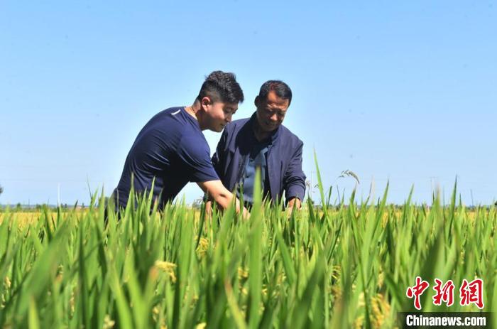 金秋時節(jié),臺胞林駿睿(左)與吉林農(nóng)民楊萬芳在稻田里觀察水稻。 高龍安 攝