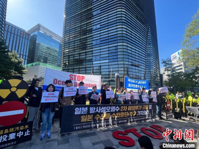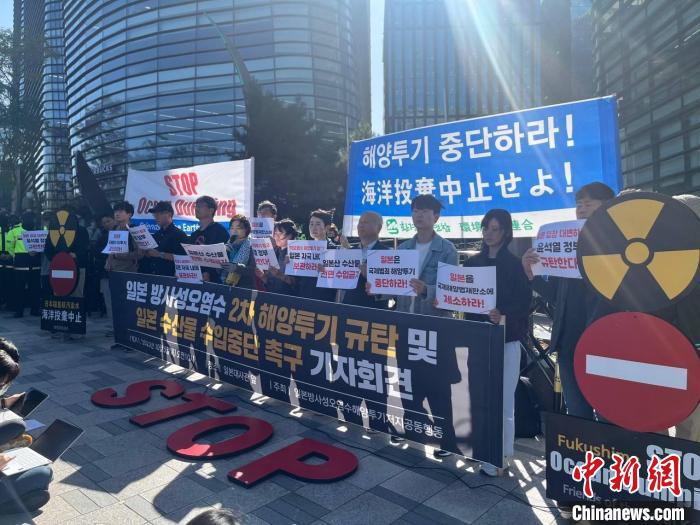 中新社首爾10月5日電 (劉旭 金琳)5日上午,韓國市民團體在位于首爾鐘路區(qū)的日本駐韓國大使館前舉行記者招待會和集會,譴責(zé)日本福島第一核電站核污染水第二輪排海,并敦促韓國政府停止進口日本水產(chǎn)品。