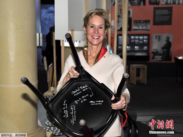 資料圖:2018年諾貝爾化學(xué)獎得主弗朗西斯·阿諾德展示其簽名的椅子。