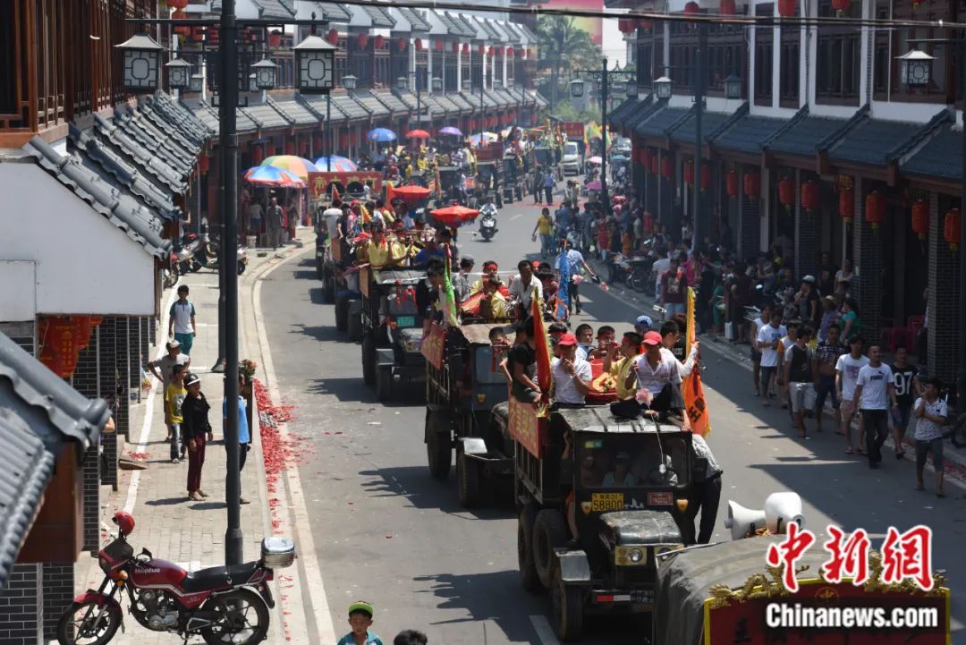 2015年4月3日,海南瓊海市萬(wàn)泉鎮(zhèn)鬧“軍坡”車(chē)隊(duì)在墟鎮(zhèn)上巡游。蒙鐘德 攝