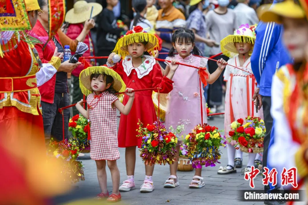 2023年2月28日,第二十二屆??谫蛉宋幕?jié)(原稱(chēng)軍坡節(jié))之“裝軍巡游”活動(dòng)在海南??谛缕骆?zhèn)舉行。圖為在活動(dòng)中肩挑花籃的小女孩。駱云飛 攝