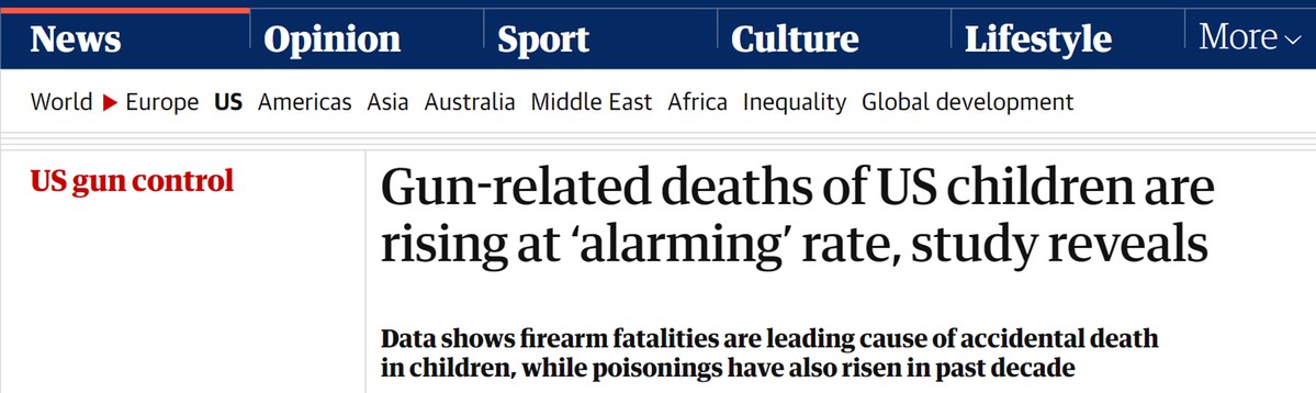 據(jù)英國(guó)《衛(wèi)報(bào)》網(wǎng)站5日?qǐng)?bào)道,美國(guó)波士頓兒童醫(yī)院(Boston Children's Hospital)研究人員進(jìn)行的一項(xiàng)新的研究發(fā)現(xiàn),在過(guò)去十年中,美國(guó)與槍支有關(guān)的兒童死亡人數(shù)激增,漲幅高達(dá)87%。