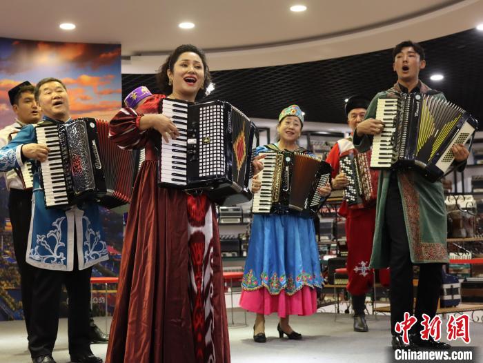 近日,記者走進伊寧市六星街,由錫伯族、哈薩克族、俄羅斯族、漢族、維吾爾族等音樂愛好者組成的手風琴樂隊正在表演?!≈行律缬浾?薄雯雯 攝