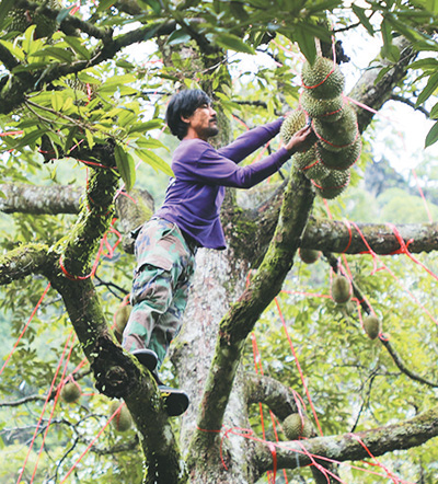 威猜站在十幾米高的榴蓮樹(shù)上,揮刀砍斷榴蓮與樹(shù)杈連接處,幾公斤重的榴蓮落了下來(lái)。樹(shù)底下,他的同伴緊盯著一個(gè)個(gè)從天而降的“刺球”,在它們落地前一瞬間,張開(kāi)麻袋,穩(wěn)穩(wěn)兜住。不一會(huì)兒,地上就碼放了一排榴蓮。