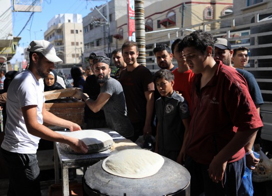 10月15日,在加沙地帶南部地區(qū),流離失所者排隊(duì)購(gòu)買(mǎi)大餅。新華社發(fā)(亞西爾·庫(kù)迪攝)