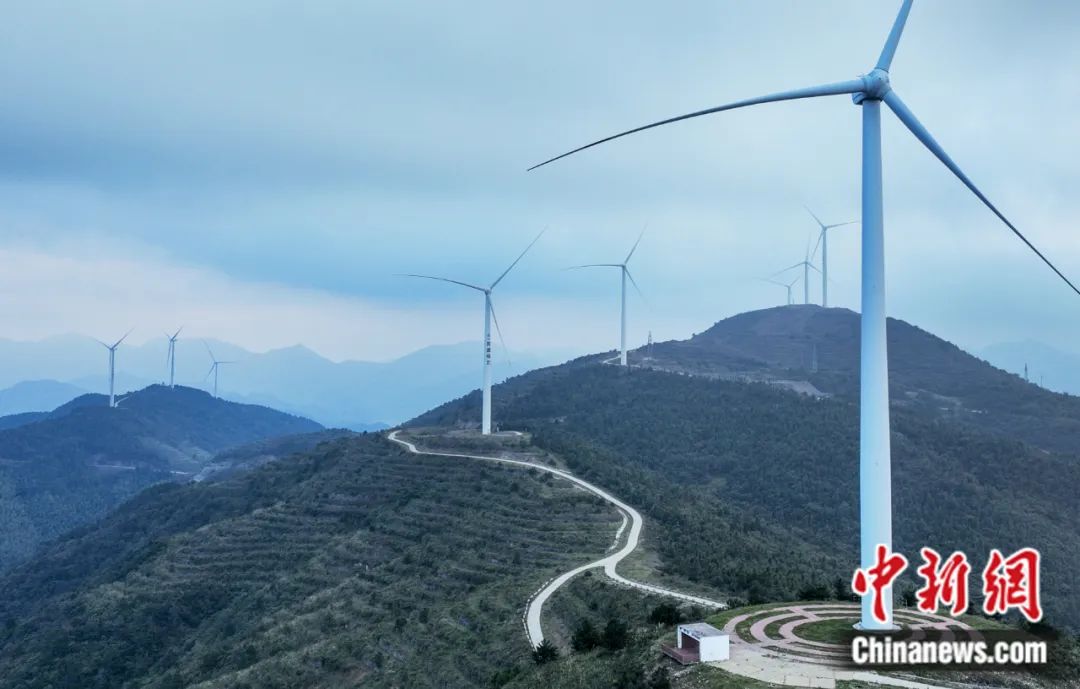 臺(tái)州市仙居縣廣度鄉(xiāng)風(fēng)力發(fā)電機(jī)。(無人機(jī)照片)陳月明 攝