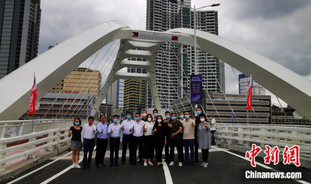 2022年4月6日,中國駐菲使館部分館員和中國駐菲企業(yè)、機(jī)構(gòu)工作人員,登上新落成的中國援建菲律賓馬尼拉B-I大橋合影留念。中國駐菲律賓大使館 供圖