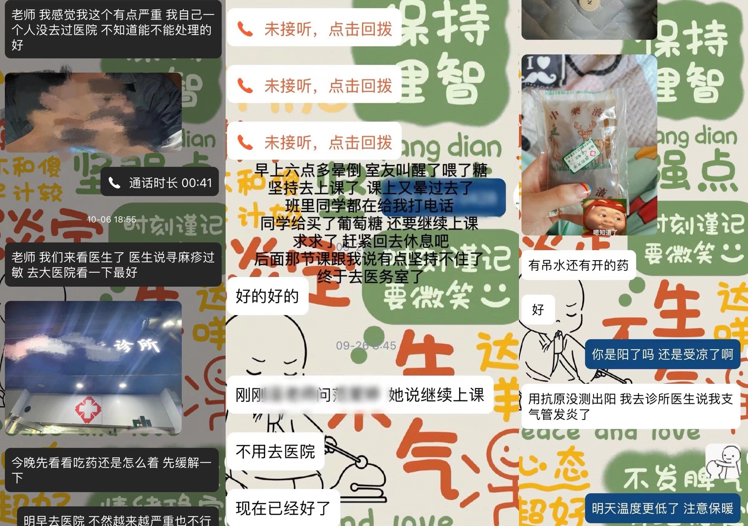 “因為我?guī)У膶W生基數(shù)較大,三百多人,每周基本上都會有十幾個因生病請假的學生?!?阿宛向中新網介紹,生病的學生中,最常見的是感冒發(fā)燒、胃疼等情況,也有一些突發(fā)狀況,比如“著急下樓收衣服結果被垃圾車刮到,半夜嘔吐到進醫(yī)院,低血糖在課上暈倒”等。