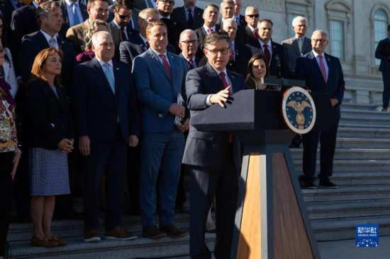10月25日,在美國華盛頓國會,新當(dāng)選的眾議院議長邁克·約翰遜發(fā)表講話。新華社發(fā)(亞倫攝)