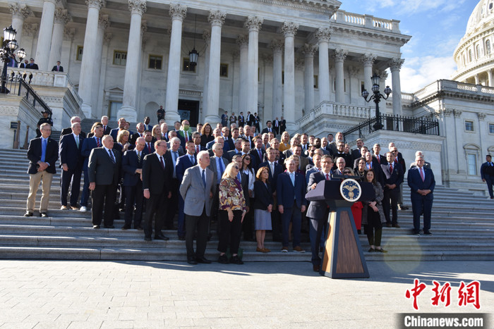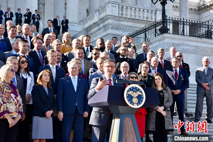 圖為約翰遜當(dāng)選議長(zhǎng)后在記者會(huì)上表示,過(guò)去幾周的議長(zhǎng)選舉讓共和黨人“更強(qiáng)大”,“我們將立刻全力以赴開(kāi)始工作”。 中新社記者 沙晗汀 攝