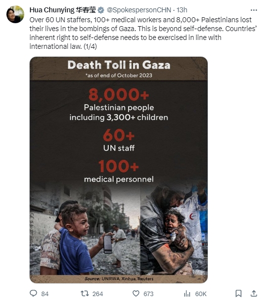 據(jù)報道,當天,華春瑩發(fā)帖提及加沙地帶的人員傷亡。她稱,“超過60名聯(lián)合國工作人員、100名醫(yī)務工作者、8000名巴勒斯坦人在對加沙的轟炸中喪生。這超出了自衛(wèi)的范圍。各國擁有的自衛(wèi)權須依據(jù)國際法行使。”