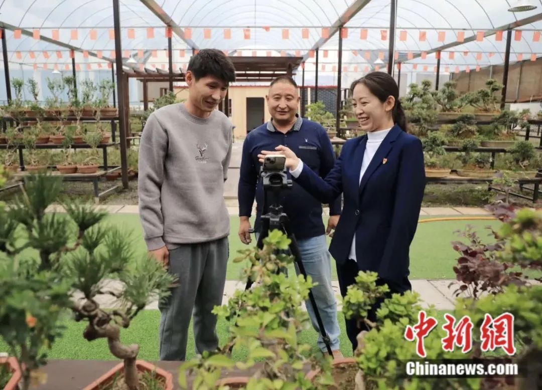 午后,在“中國盆景淘寶第一村”新河鎮(zhèn)周圈村,花農(nóng)姜愛花忙著給一株刺柏“盛裝打扮”,晚上,這株刺柏會被送往該村的“花木集市”,數(shù)十名主播將對其直播競拍。