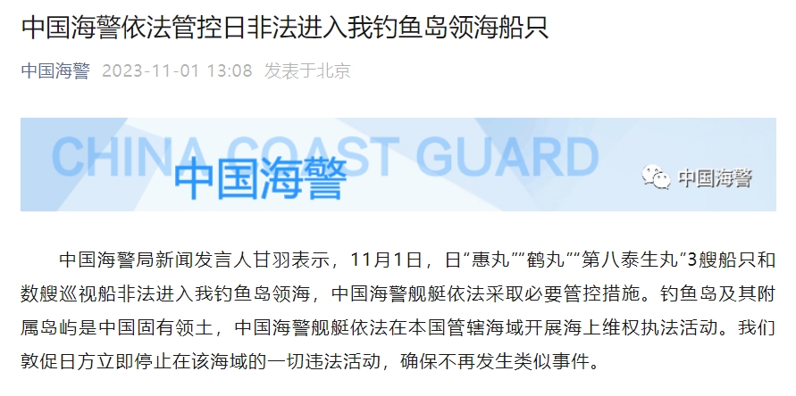 中新網(wǎng)11月1日電 據(jù)中國海警微博消息,中國海警局新聞發(fā)言人甘羽表示,11月1日,日“惠丸”“鶴丸”“第八泰生丸”3艘船只和數(shù)艘巡視船非法進(jìn)入我釣魚島領(lǐng)海,中國海警艦艇依法采取必要管控措施。釣魚島及其附屬島嶼是中國固有領(lǐng)土,中國海警艦艇依法在本國管轄海域開展海上維權(quán)執(zhí)法活動(dòng)。我們敦促日方立即停止在該海域的一切違法活動(dòng),確保不再發(fā)生類似事件。
