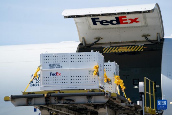 11月8日,在美國弗吉尼亞州的華盛頓杜勒斯國際機(jī)場(chǎng),裝有大熊貓的特制“旅行包廂”準(zhǔn)備運(yùn)上專機(jī)。新華社記者劉杰攝