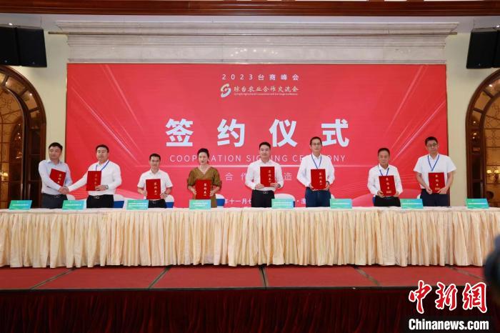 11月7日,2023臺商峰會瓊臺農(nóng)業(yè)合作交流會在海南澄邁舉行。圖為相關(guān)機構(gòu)和企業(yè)在會上進行投資合作框架協(xié)議簽約。海南省農(nóng)業(yè)交流協(xié)會供圖
