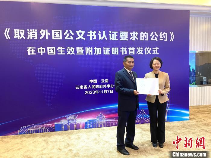 中新網(wǎng)昆明11月7日電 (陳靜)《取消外國公文書認證要求的公約》(下稱《公約》)7日在中國生效實施。當日,云南省政府外事辦公室主任楊沐向云南省公證協(xié)會會長周海春頒發(fā)了全省首張附加證明書。