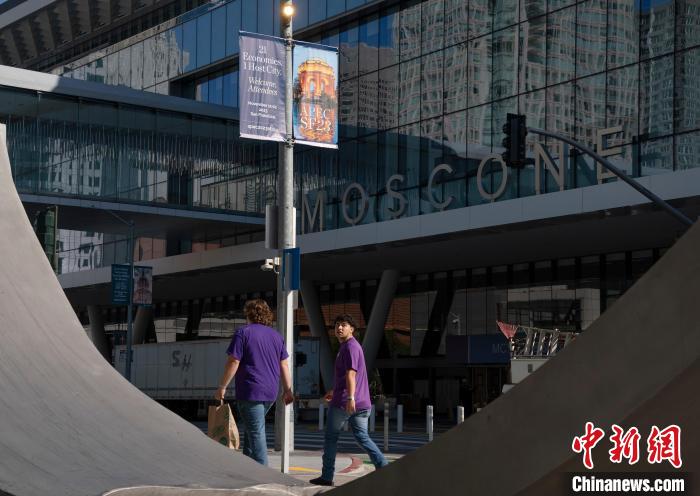當(dāng)?shù)貢r間11月7日,民眾從舊金山莫斯康中心附近經(jīng)過?!≈行律缬浾? 劉關(guān)關(guān) 攝